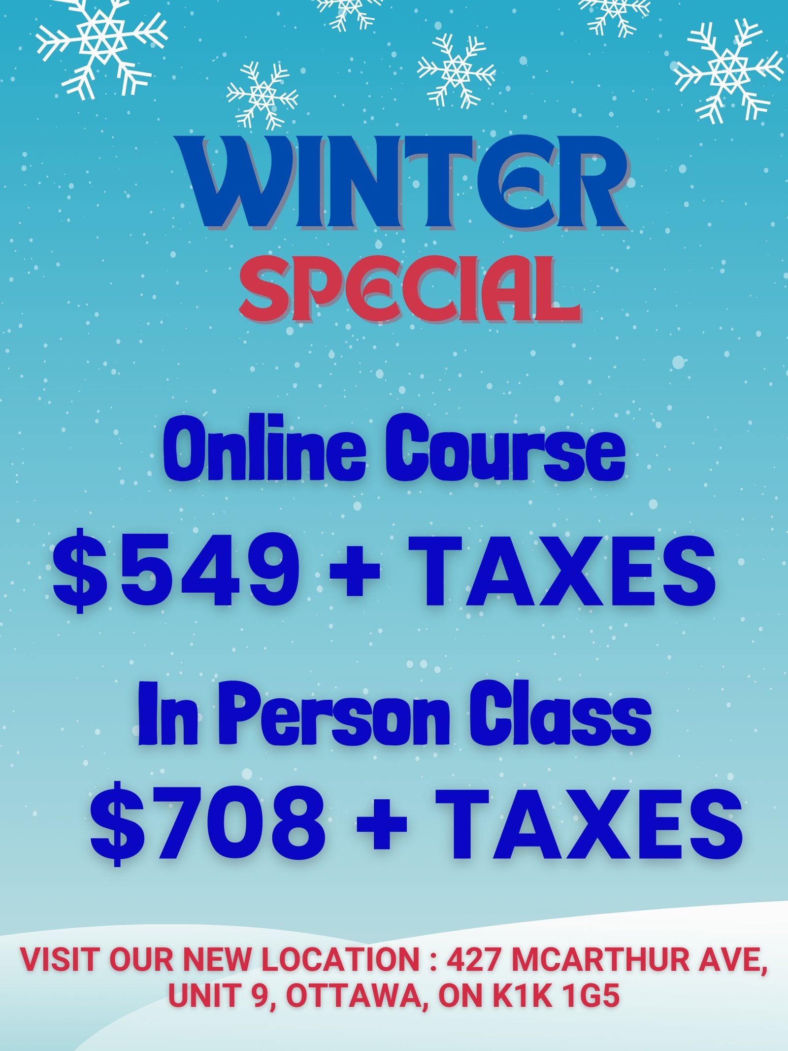 The in class portion of the course can be completed in our office located at; 569 McArthur Ave., Ottawa, Ontario. This is located near St.Laurent Shopping Center, if you using public transit, you can take the Bus # 14 and get off at McArthur / St.Laurent.